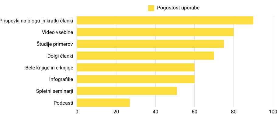 Med različnimi oblikami vsebin vsekakor prednjačijo zapisi na blogu, vendar jih video hitro dohiteva. Ta premik je odraz splošnega trenda na spletu, kjer video postaja prevladujoča oblika komunikacije. Katere so torej najbolj priljubljene vsebine in kakšno je mnenje o njihovi učinkovitosti med tržniki?